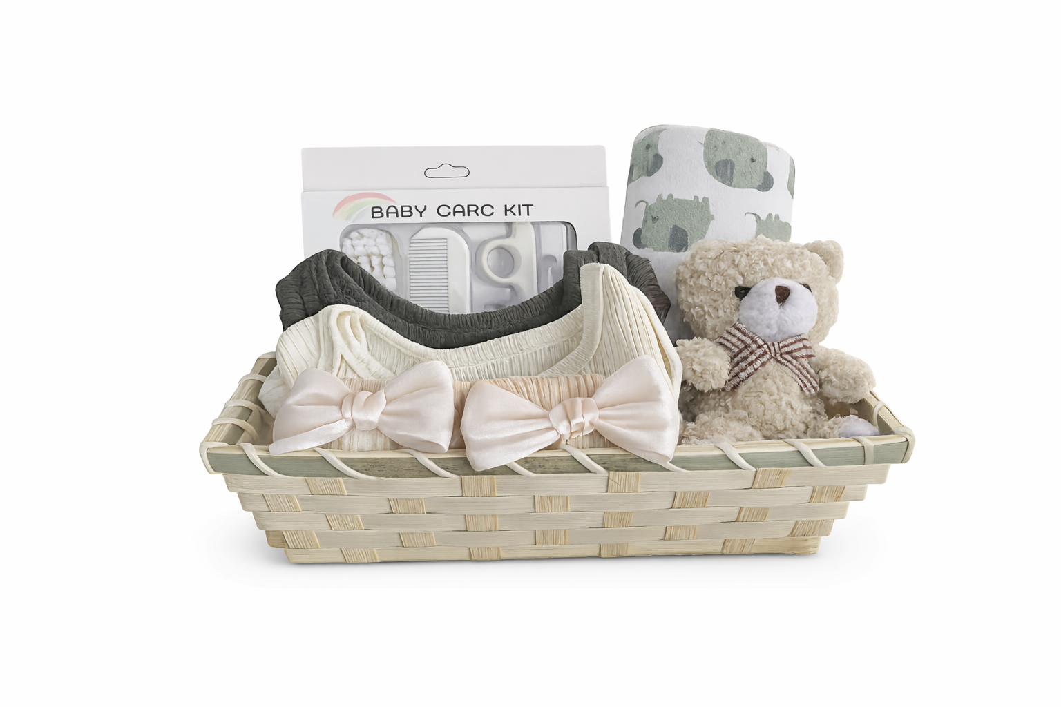 What’s inside.. 2x Ribbed Knitted Onesie Cream & Olive Green, Socks with Bow, Swaddle Blanket, Baby Care Kit, Plush Teddy in Woven Basket