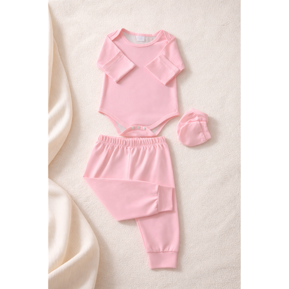 Plain Pink Long Sleeve Onesie, Pants and Mittens Set.